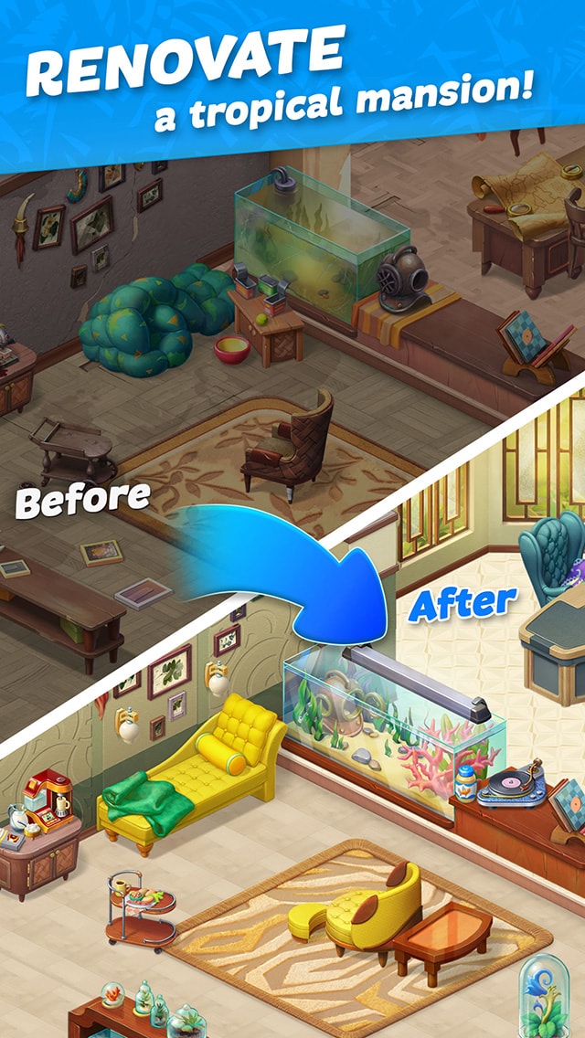 Embark on an adventurous journey: beat match-3 puzzles, decorate rooms according to your taste, restore the mansion’s gorgeous beach and enjoy the company of amusing characters. Get to the bottom of family secrets and find out the Lockwoods’ mysterious history, which began more than two hundred years ago, when pirates plied the surrounding seas!