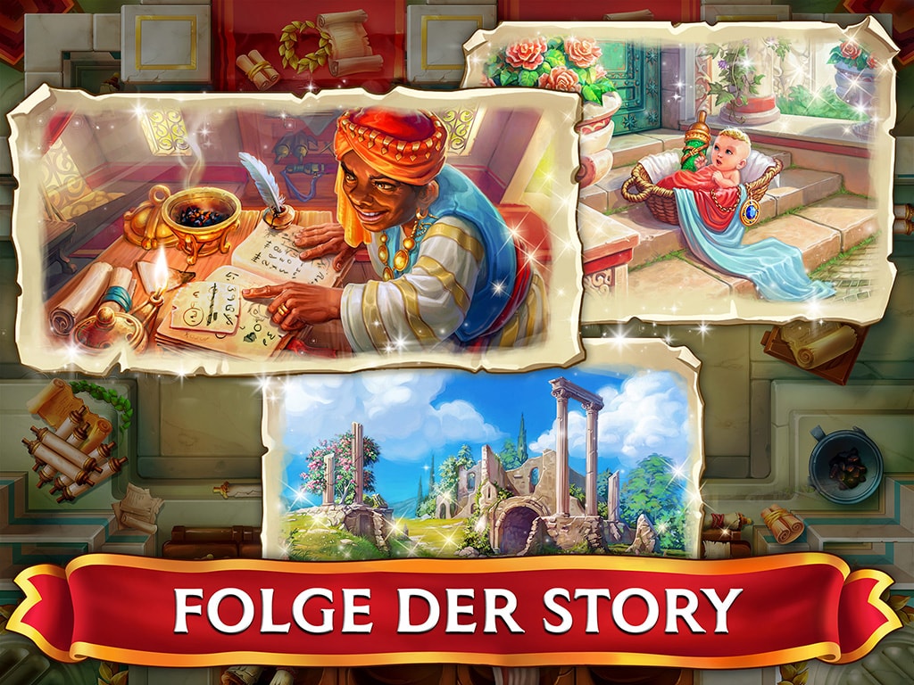 Dieses Spiel ist eine einzigartige und epische Kombination aus Städtebau und 3-Gewinnt, verknüpft durch eine Handlung voller Wendungen, mediterrane Kultur und ein stimmungsvolles und lebhaftes Setting des antiken Roms. Du wurdest zum Präfekten einer notleidenden Siedlung in einer entfernten Ecke des Römischen Reiches ernannt. Hilf den fest entschlossenen Bewohnern, ihre Gemeinschaft wiederzubeleben, nach einem verhängnisvollen Verrat durch deinen hinterhältigen Vorgänger Cassius. Rekonstruiere eine beeindruckende, legendäre Siedlung, verhindere Cassius’ bösen Machenschaften, und stell sicher, dass deinen Einwohnern nochmals das Glück winkt.