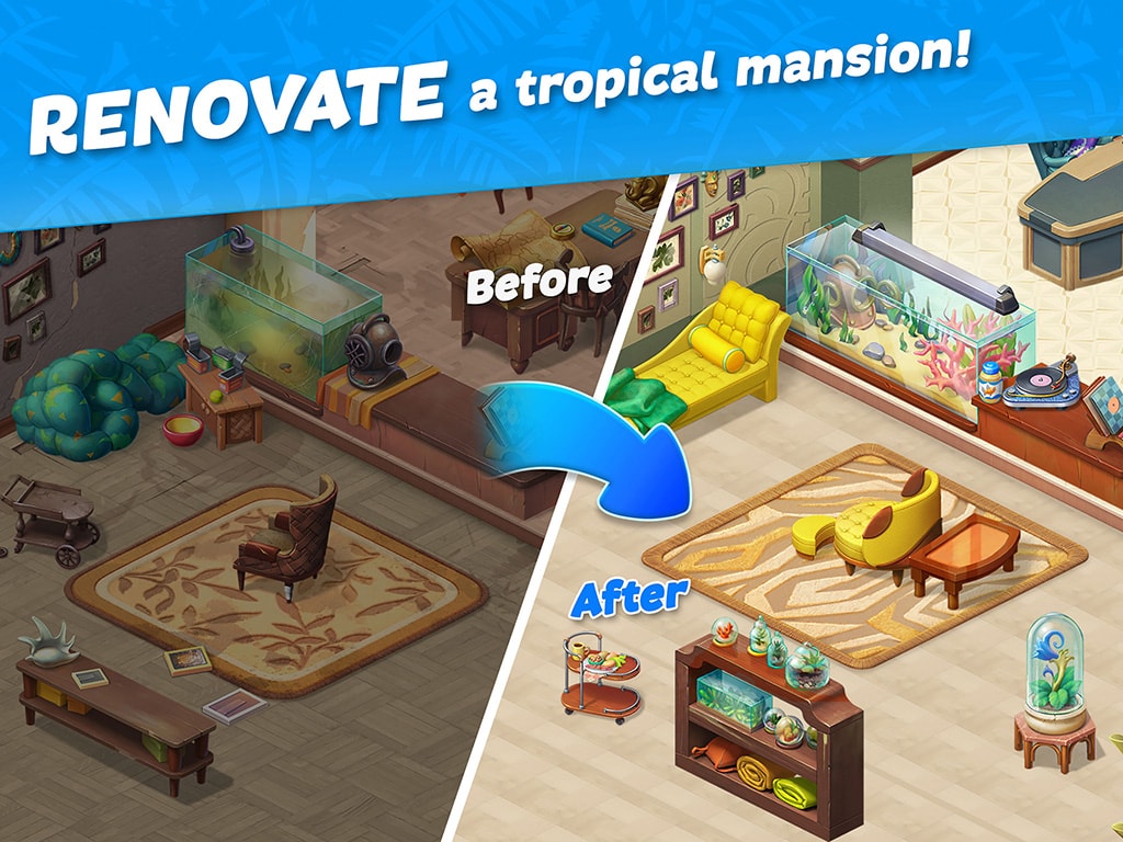 Embark on an adventurous journey: beat match-3 puzzles, decorate rooms according to your taste, restore the mansion’s gorgeous beach and enjoy the company of amusing characters. Get to the bottom of family secrets and find out the Lockwoods’ mysterious history, which began more than two hundred years ago, when pirates plied the surrounding seas!