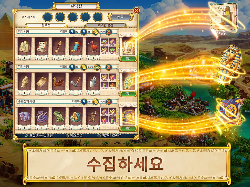 수백 가지 매치-3 퍼즐 레벨을 통과하며 보석을 서로 바꾸고 짝을 맞추어 자원을 모으고 파라오를 도와 폐허가 된 문명을 되살리세요. 웅장한 피라미드, 신전, 궁궐과 오벨리스크까지 모두 만나볼 수 있어요!