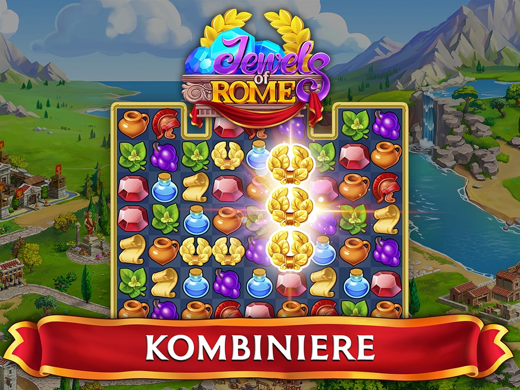 Reise in die Vergangenheit ins alte Rom mit Jewels of Rome®! Eine arme Siedlung in einer abgelegenen, aber wunderschönen Ecke des Römischen Reiches braucht deine Hilfe, um ihren alten Glanz wiederherzustellen. Spiele Tausende 3-Gewinnt-Levels, triff charismatische Figuren, folge der spannenden Handlung und baue dieses eng verbundene Dorf zu einer großen römischen Stadt auf!