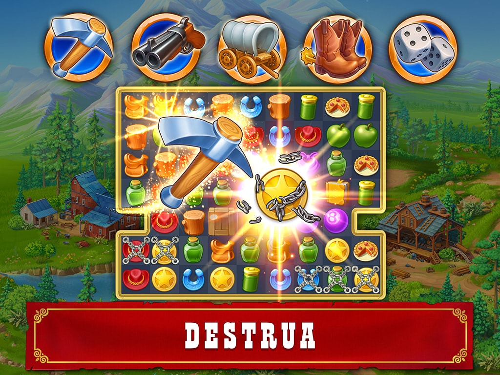 Esse jogo é uma combinação épica e exclusiva de construção de cidade e combinar 3, junto com uma história cheia de reviravoltas, espíritos livres e realidades difíceis do Oeste Selvagem. Você é um construtor talentoso que respondeu a um anúncio de procura de ajuda em Colinstown, uma base problemática no Velho Oeste. Ajude os cidadãos determinados a reviver sua comunidade após os ataques devastadores da Gangue de Butler que pode ser bancada pelo magnata corrupto Richard Pierce. Reconstrua uma cidade impressionante, digna de lendas do Velho Oeste, torne-se o novo prefeito de Colinstown e frustre as conspirações dos bandidos para garantir que a fortuna favoreça seus cidadãos mais uma vez!